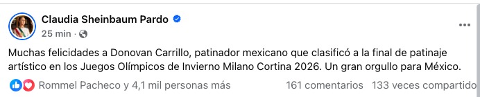 La presidenta Claudia Sheinbaum felicitó al deportista en su cuenta de X: "Un gran orgullo para México".