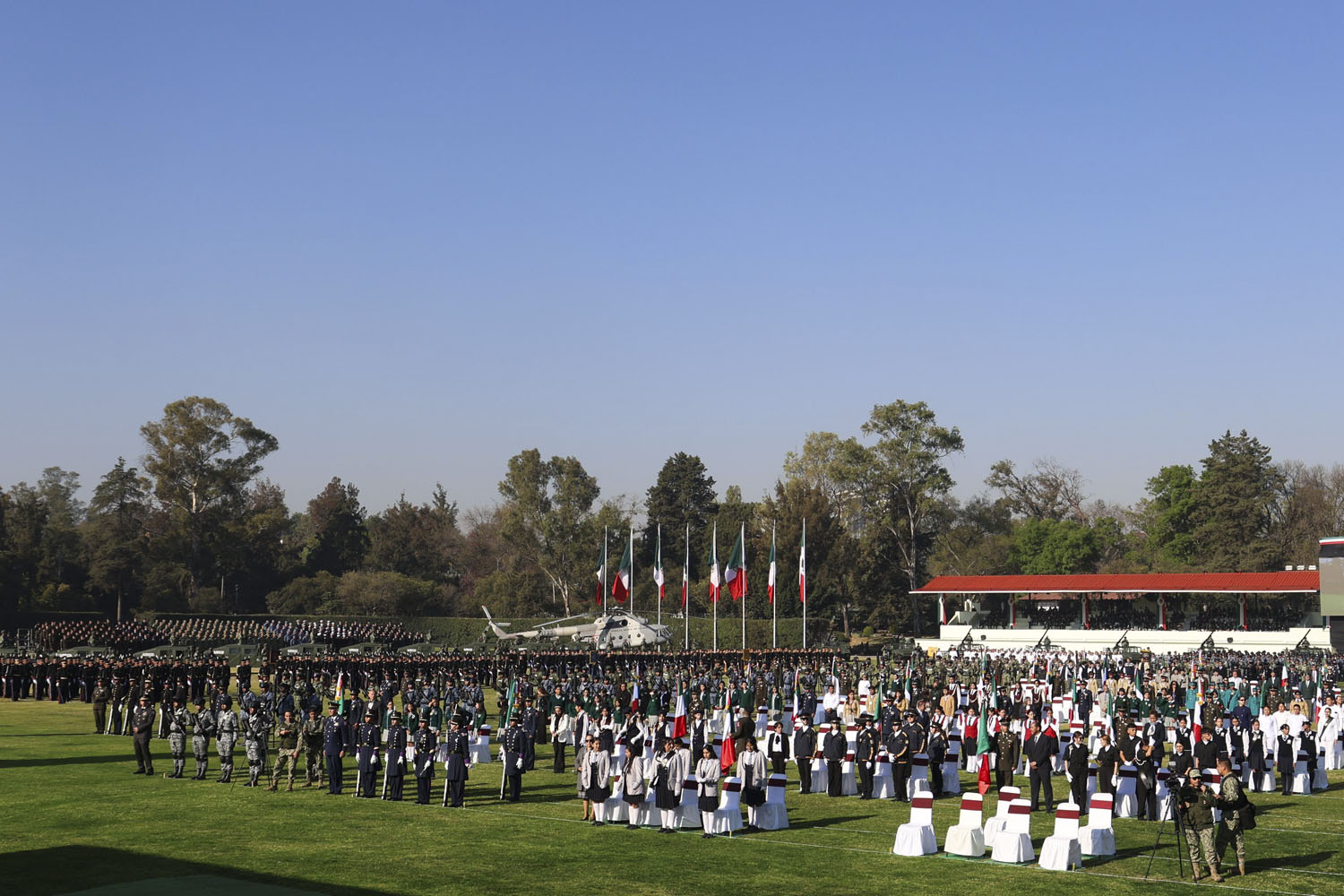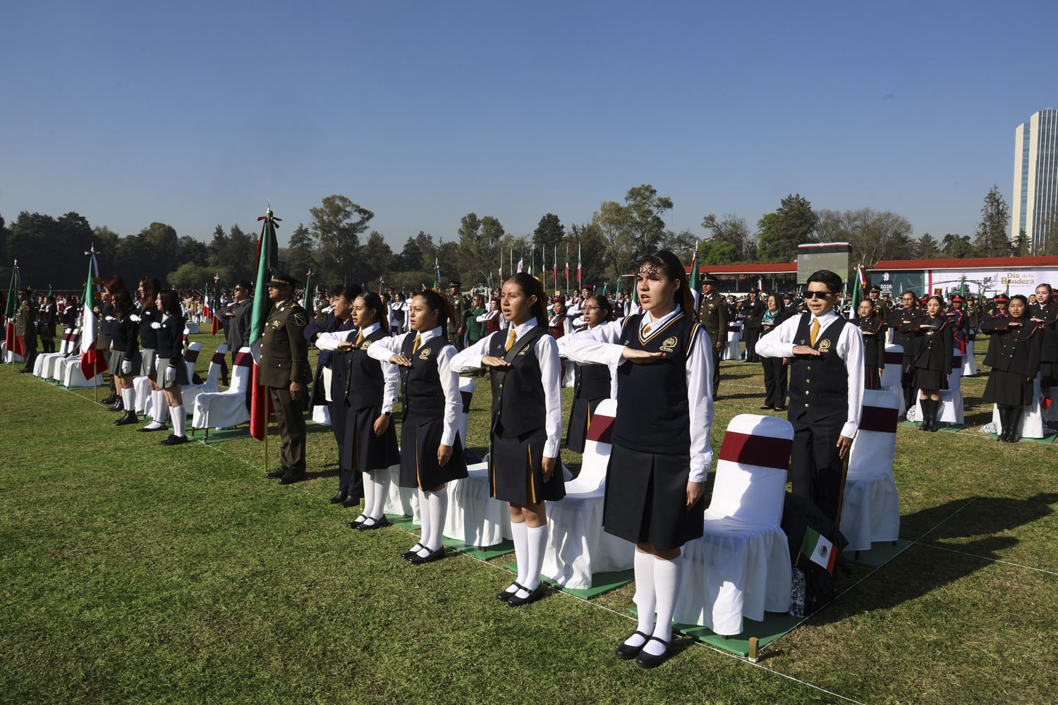 Al iniciar el acto, la mandataria federal izó a toda asta el imponente lábaro patio que ondeó sobre el Campo Marte, flanqueada por los titulares de las secretarías de la Defensa Nacional, general Ricardo Trevilla, y de la Marina, almirante Raymundo Morales. La acompañaron también los titulares de la Secretaría de Gobernación, Rosa Icela Rodríguez, y de la Secretaría de Educación Pública, Mario Delgado.