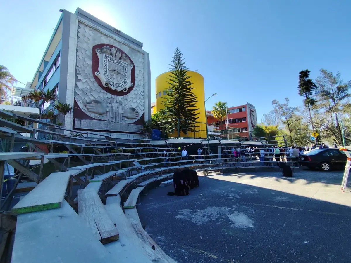 Estudiantes de la licenciatura en Derecho de la Universidad Veracruzana, en la ciudad de Xalapa, resultaron lesionados al vencerse una estructura a la que había subido para realizar la toma de fotos de generación.