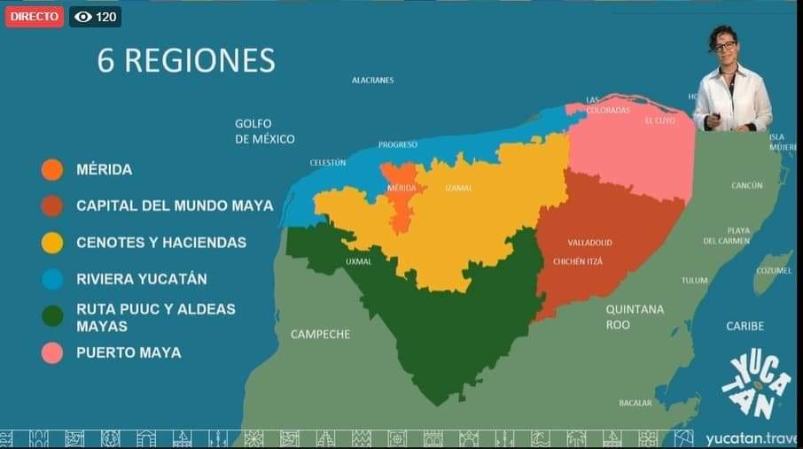 Para conocer más a detalle los atractivos de Yucatán, mostró en un mapa la entidad dividida en seis zonas: Mérida, que cuenta con una vasta oferta de centros comerciales, museos, escuelas, hospitales, restaurantes, zonas arqueológicas, cenotes, actividades culturales todos los días; luego, en el oriente, la capital del Mundo Maya, conformada por una de las maravillas del mundo moderno, Chichén Itzá y el pueblo mágico de Valladolid; Cenotes y Haciendas, que se ubican en el corazón del estado; la Riviera Yucatán, formada por toda la costa.