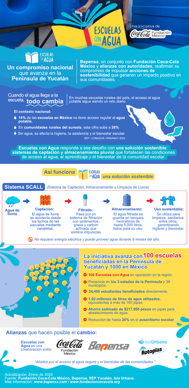 Bepensa señala que la sostenibilidad y el trabajo conjunto con comunidades y aliados estratégicos son pilares fundamentales. A través de Escuelas con Agua, se fortalecen las condiciones de acceso al agua, el aprendizaje y el bienestar de miles de estudiantes. La implementación de estos sistemas ha contribuido a reducir hasta en 20 por ciento el ausentismo escolar, al mejorar las condiciones de higiene y funcionamiento de los planteles educativos.