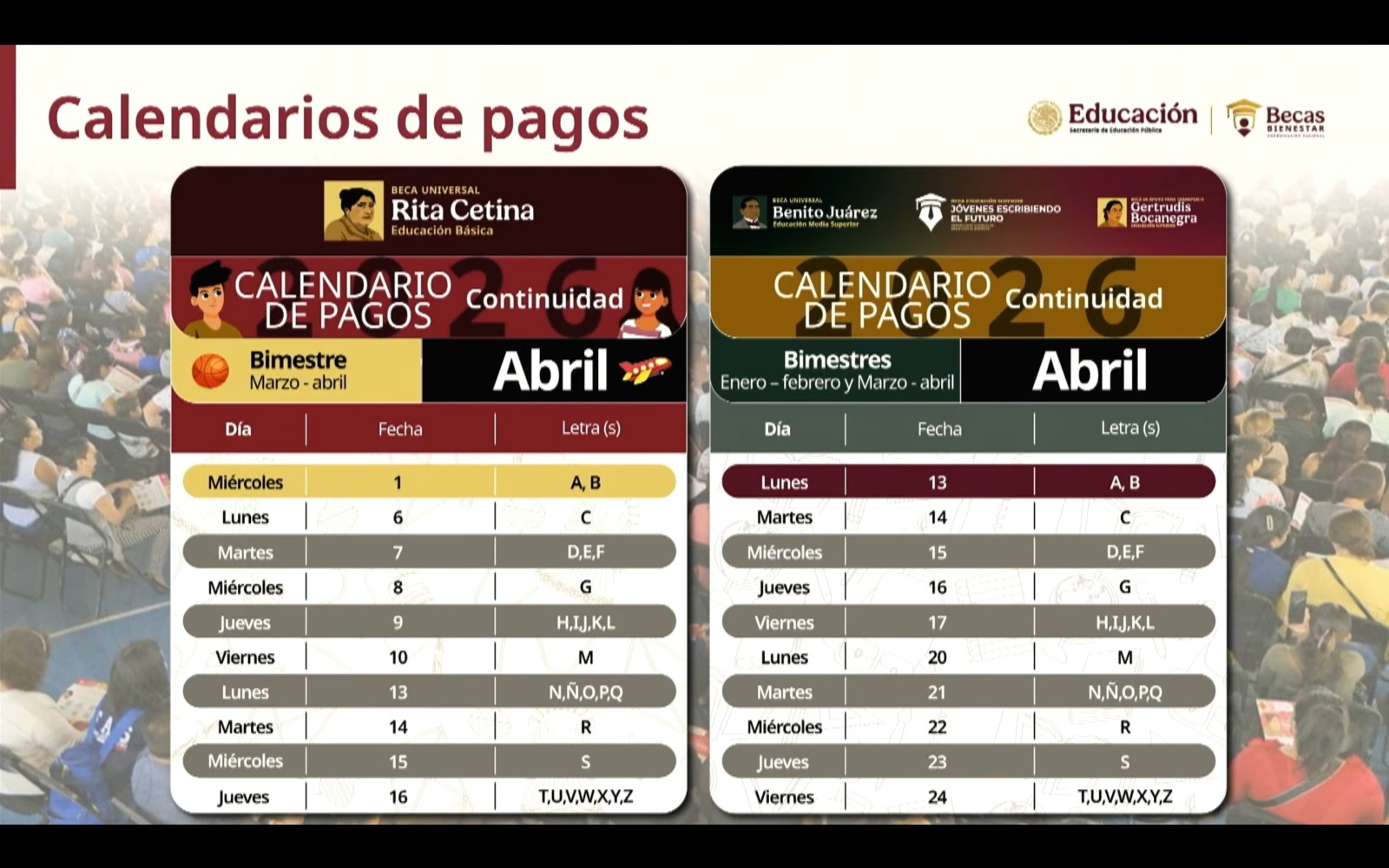 De acuerdo con el calendario oficial, los depósitos se realizarán durante abril conforme a la primera letra del apellido paterno de las y los beneficiarios. Las fechas quedaron organizadas de la siguiente manera: lunes 13 de abril para las letras A y B; martes 14 para la letra C; miércoles 15 para D, E y F; jueves 16 para G; viernes 17 para H, I, J, K y L; lunes 20 para la letra M; martes 21 para N, Ñ, O, P y Q; miércoles 22 para R; jueves 23 para S; y viernes 24 de abril para T, U, V, W, X, Y y Z.