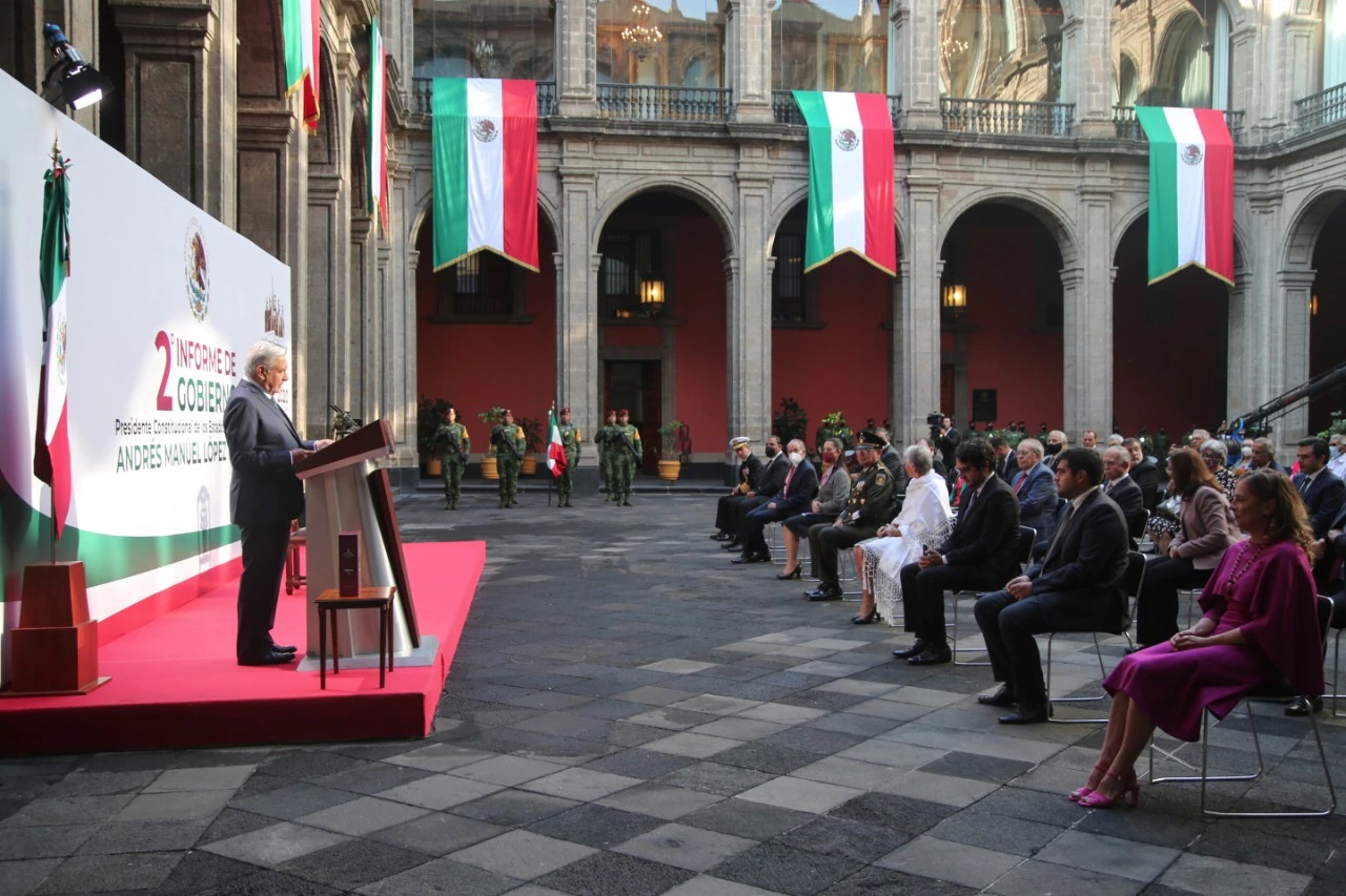 En el patio de honor de Palacio Nacional, acompañado de su gabinete, invitados especiales de los sectores obrero, empresarial y grupos indígenas, López Obrador dijo que la austeridad republicana es una realidad de hechos, no de palabras pues ya no hay lujos en el gobierno. El mandatario señaló que en su momento se le ha reprochado que no se emprendió un rescate económico, pero es un timbre de orgullo decir que ayudamos a 23 millones de familias con al menos uno de los programas sociales, sean pensiones para adultos mayores, becas a estudiantes o apoyos a niños con discapacidad.