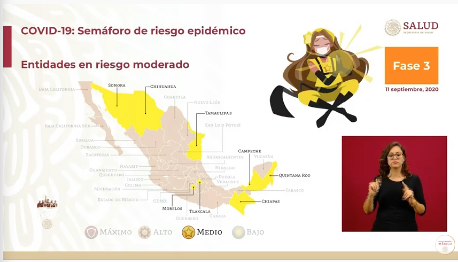 Detalló que ninguna entidad está en riesgo máximo por COVD-19, es decir, en semáforo rojo. La mayoría de los estados de la República se mantienen en semáforo naranja; mientras que ocho entidades permanecen en amarillo, estás son Sonora, Chihuahua, Tamaulipas, Campeche, Quintana Roo, Chiapas, Tlaxcala y Morelos.