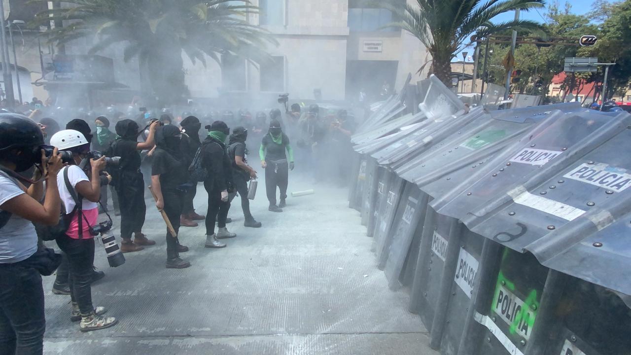 A la altura de la calle Balderas, sobre la avenida Juárez, las manifestantes fueron encapsuladas por el Grupo Atenea, integrado por mujeres, con quienes se enfrentaron para exigirles que las dejaran avanzar.