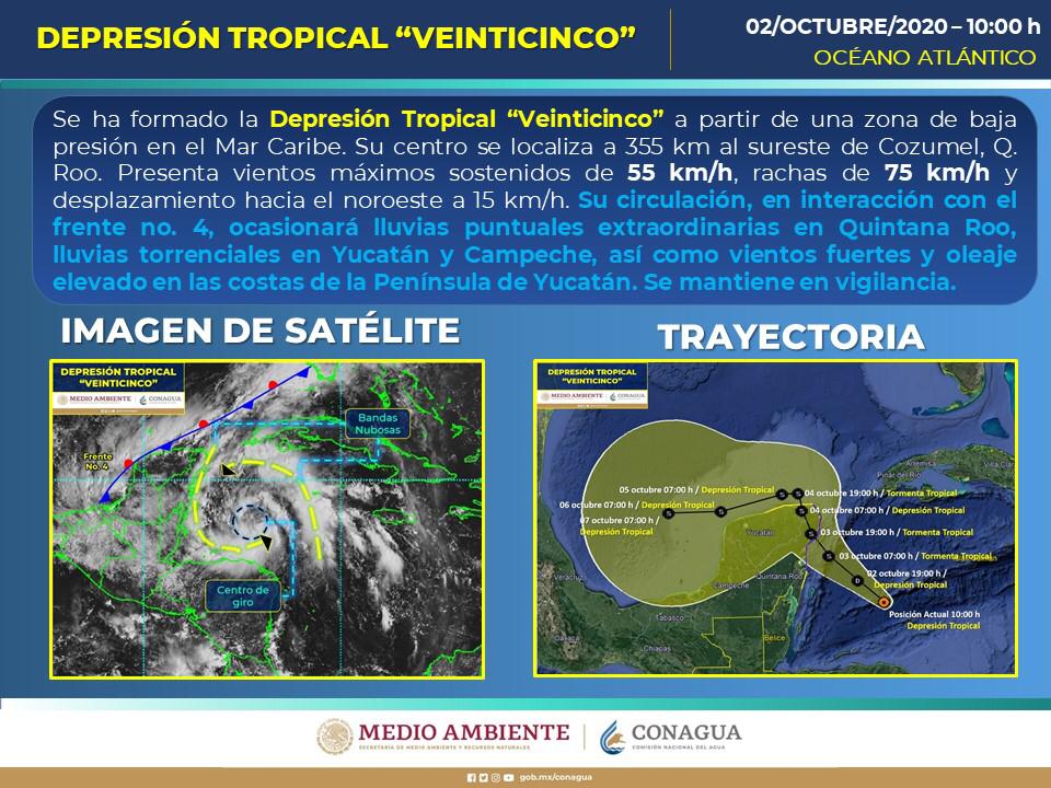A partir de una zona de baja presión en el mar caribe se formó la depresión tropical 25, cuya interacción con el frente frío 4 ocasionará lluvias en los tres estados de la Península de Yucatán.