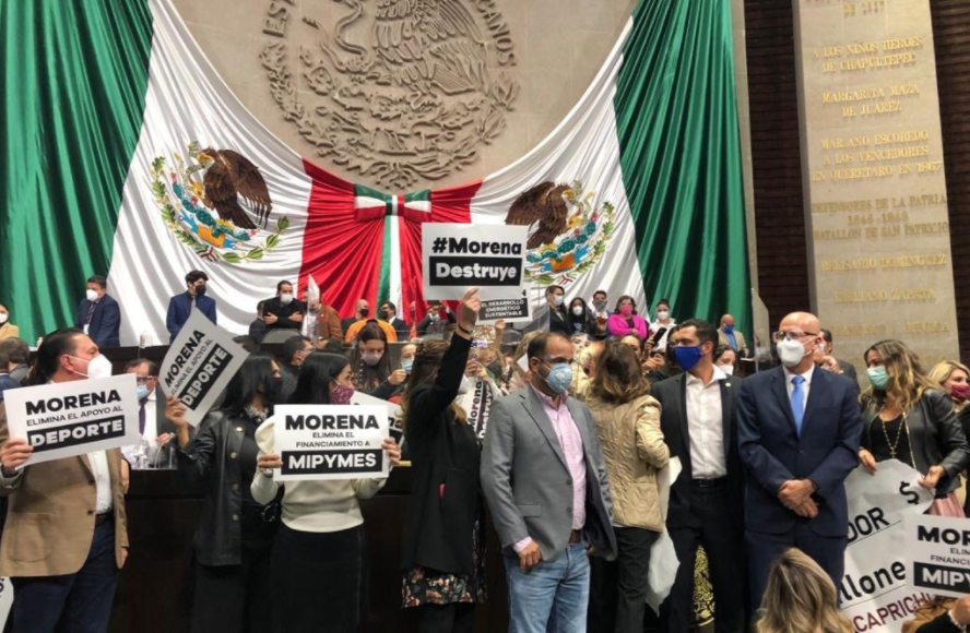 Los diputados de Morena arrancaron una manta que los diputados del PAN llevaron a la tribuna. Molestos por el lance de la oposición, los diputados de Morena exclamaron: “¡Quieren moches, quieren moches!” En respuesta, los panistas exclamaron: “¡Pío, Pío, Pío..!”.
