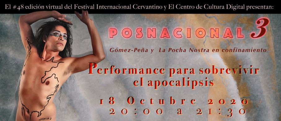 En Posnacional 3, Gómez-Peña plantea una reinvención total del oficio y los medios creativos que permita recuperar el arte y la poética del cuerpo en la vida cotidiana durante el confinamiento. Propone convertir las casas en laboratorios de performance, desafiando múltiples fronteras geográficas, raciales, generacionales y artísticas.