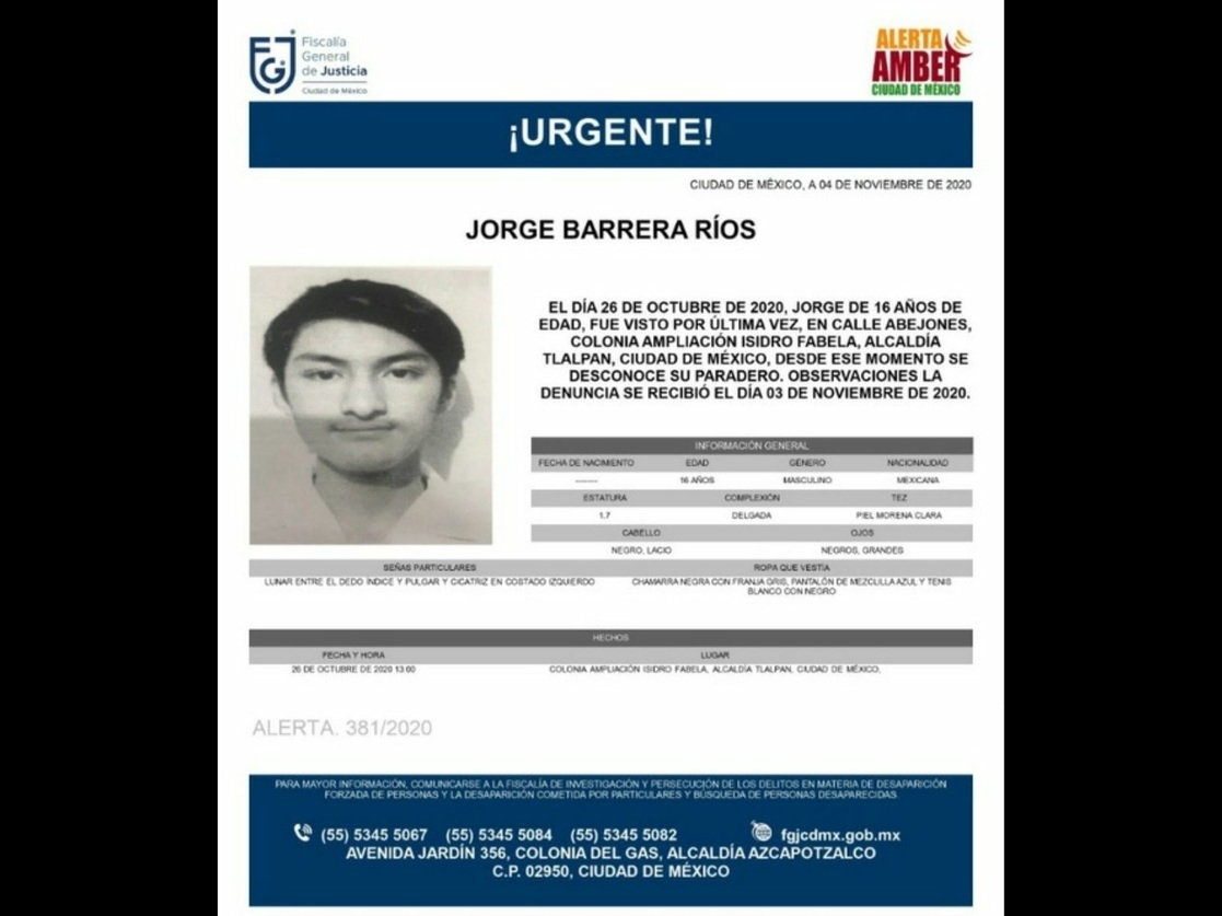 Por su parte, la Fiscalía General de Justicia de la Ciudad de México emitió una Alerta Amber para localizar al estudiante —luego de recibir una denuncia el pasado martes 3 de noviembre—, en la cual señala que Barrera, de 16 años de edad, fue visto por última vez el 26 de octubre en las inmediaciones de la Preparatoria 5.