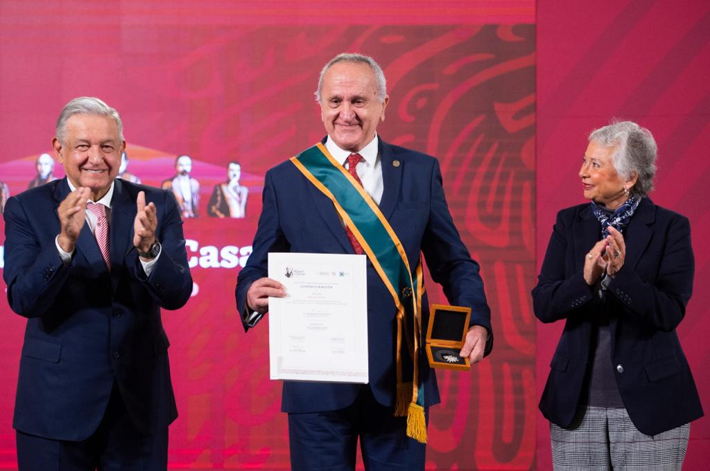 Olga Sánchez Cordero, secretaria de Gobernación, señaló que esta ocasión la entrega de la condecoración cobra mayor relevancia porque se distingue a un mexicano “por excelencia, que ha permitido que haya más México en el mundo y más mundo en México”.