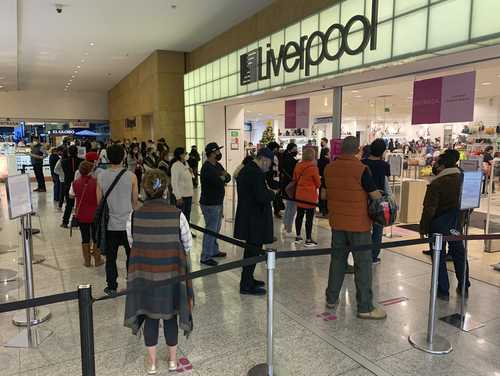 A menos de tres horas de su cierre, Liverpool tenía una fila de más de 80 personas para entrar, en tanto que las tiendas de H&M, Zara y Cuidado con el Perro sus aforos estaban saturados, por lo que decenas de personas esperaban en la fila a que otros clientes salieran para poder ingresar.