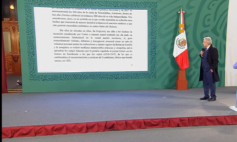 El presidente Andrés Manuel López Obrador dio a conocer la carta enviada al rey de España Felipe VI el 25 de marzo de 2019, en la que solicita que el Estado español pida perdón por los agravios cometidos en la Conquista, e iniciar un proceso de reconciliación rumbo a los 500 años del acontecimiento en Tenochtitlan, además de convocar a un acto conjunto en 2021 en este marco.
