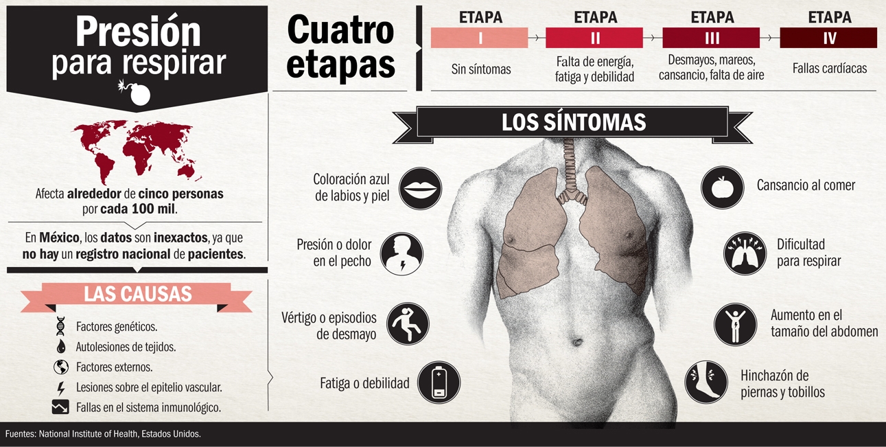 El coordinador de la Clínica de Hipertensión Pulmonar del Centro Médico Nacional 20 de Noviembre del ISSSTE agregó que el tiempo y las recurrencias condicionan a un aumento en la presión arterial pulmonar, que puede generar insuficiencia cardiaca derecha.