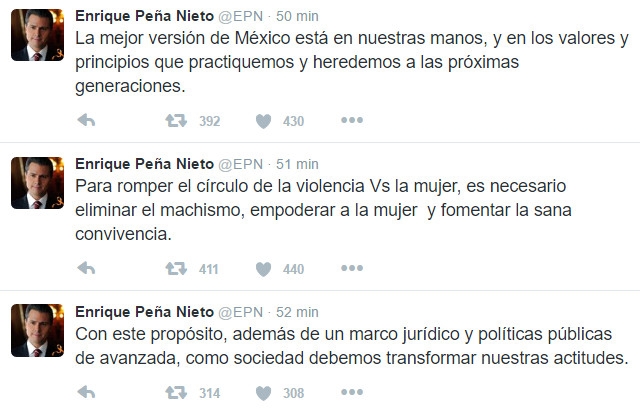 El mandatario tuiteó en cuatro oportunidades para conmemorar el Día Internacional de la Eliminación de la Violencia contra la Mujer, declarado así -señaló- por la ONU hace 17 años.