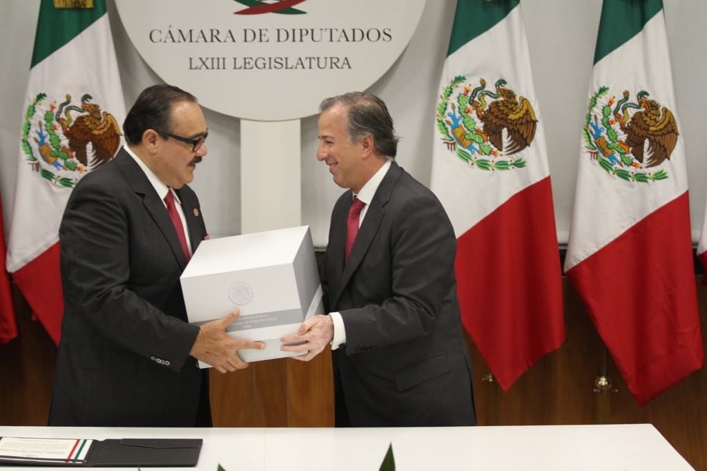 El secretario de Hacienda, José Antonio Meade, entregó a la Cámara de Diputados la propuesta de paquete económico 2017, que considera un recorte de 239 mil 700 millones, equivalente al 1.2 por ciento del Producto Interno Bruto (PIB), que se centra en la reducción de servicios personales y un ajuste al gasto de operación del gobierno federal, pero no afectará a los programas de combate a la pobreza ni a las transferencias a estados y municipios.