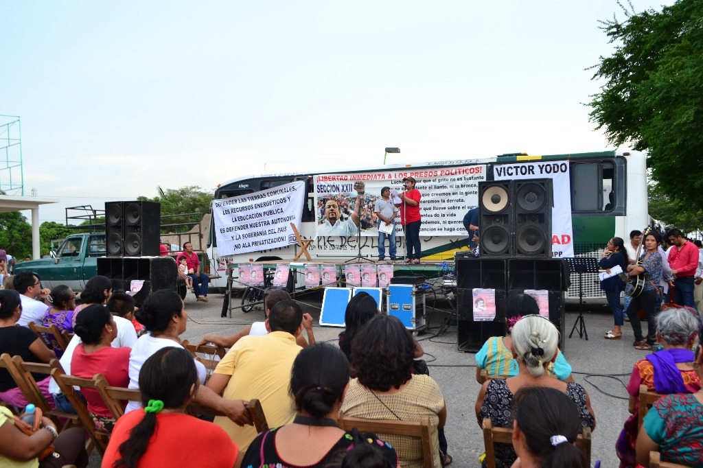 “¡Libertad! ¡Libertad! Eso es lo que queremos para nuestros presos políticos”, corearon los maestros, padres de familia e integrantes de organizaciones sociales en el encuentro cultural y político que organizó la sección 22 de la Coordinadora Nacional de Trabajadores de la Educación (CNTE), anoche en la conmemoración de los 38 años de la desaparición forzada del profesor Víctor Pineda Henestrosa, Víctor Yodo, en Juchitán.