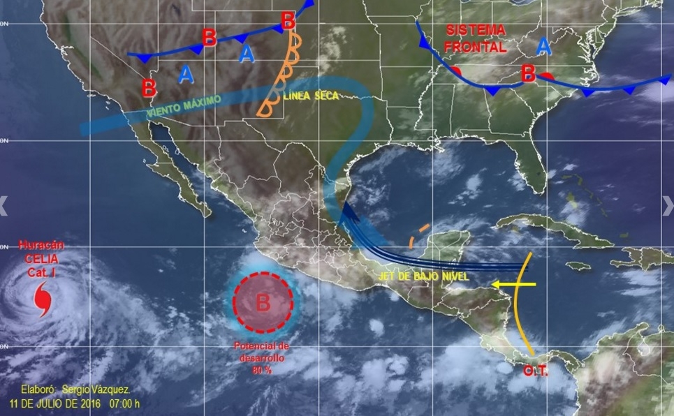 Las condiciones meteorológicas para el Pacífico Centro indican cielo nublado, 80 por ciento de probabilidad de tormentas puntuales muy fuertes en Nayarit y Jalisco, y tormentas fuertes en Colima y Michoacán.