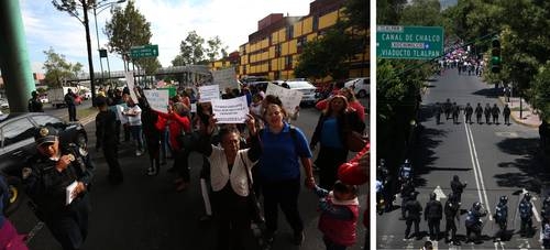 En tanto, cientos de maestros, padres de familia y alumnos también realizaron actos de protesta en San Lorenzo Tezonco, y una marcha del Reclusorio Oriente al Periférico y avenida Tláhuac; otra en Prolongación División del Norte y Guadalupe I. Ramírez; en Calzada Taxqueña y Escuela Naval Militar; San Fernando y Tlalpan; Ejido y avenida Benito Juárez, en la delegación Gustavo A. Madero; en Patriotismo y Extremadura; en avenida 510 y 509, en San Juan de Aragón; en Congreso de la Unión y Hortelanos; en Avenida 8 y calle 29, en la delegación Venustianos Carranza, y en avenida del Taller y calzada La Viga, entre otros puntos.