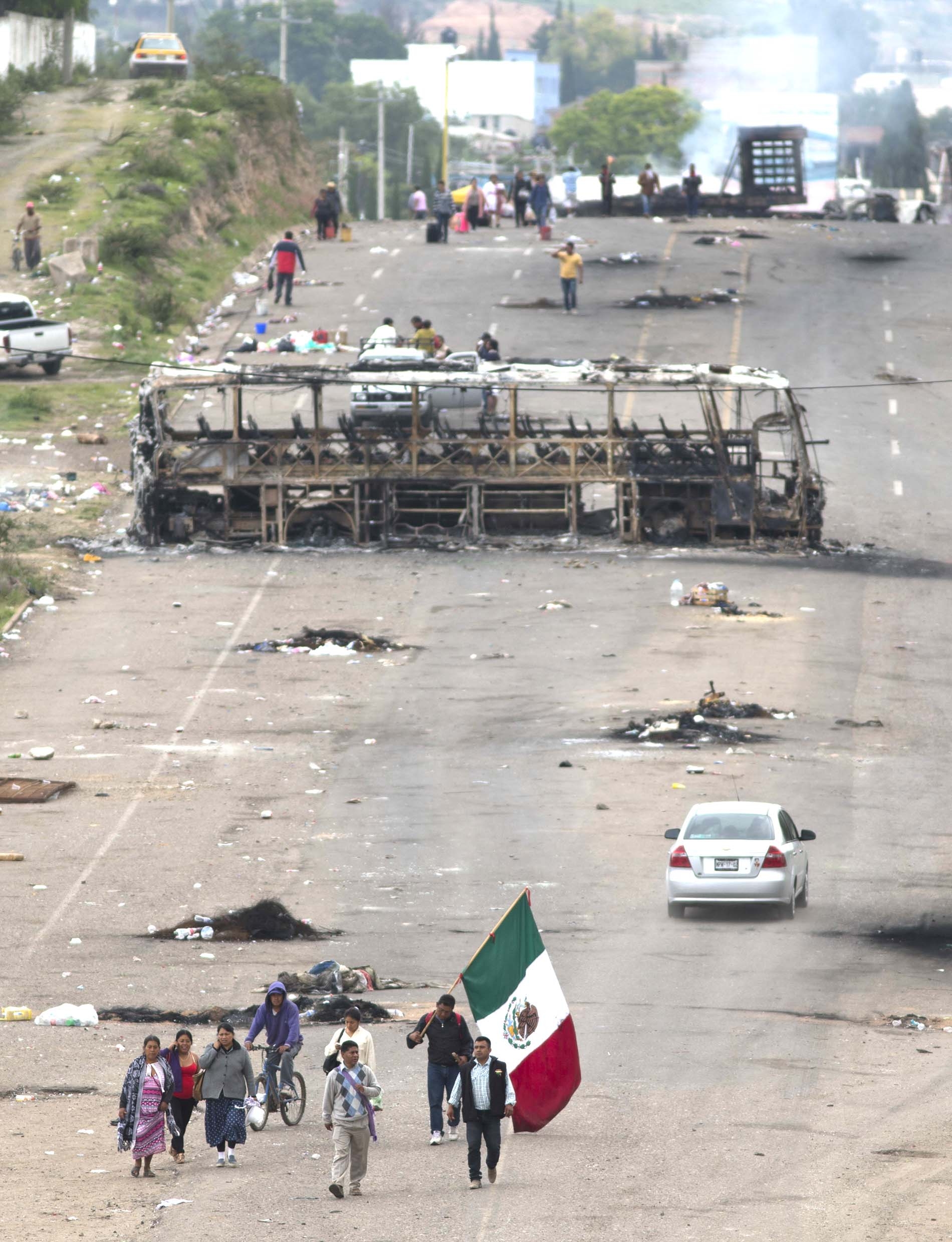 Un manifestante camina con la bandera mexicana por una carretera del estado de Oaxaca, cerca del pueblo de Nochixtlán, ayer lunes. La policía mexicana declaró que algunos maestros estuvieron involucrados en la violenta protesta del fin de semana, en la cual 6 personas murieron. Los maestros están contra la reforma del sistema de educación del país; la cual, señalan, es en realidad una reforma laboral.