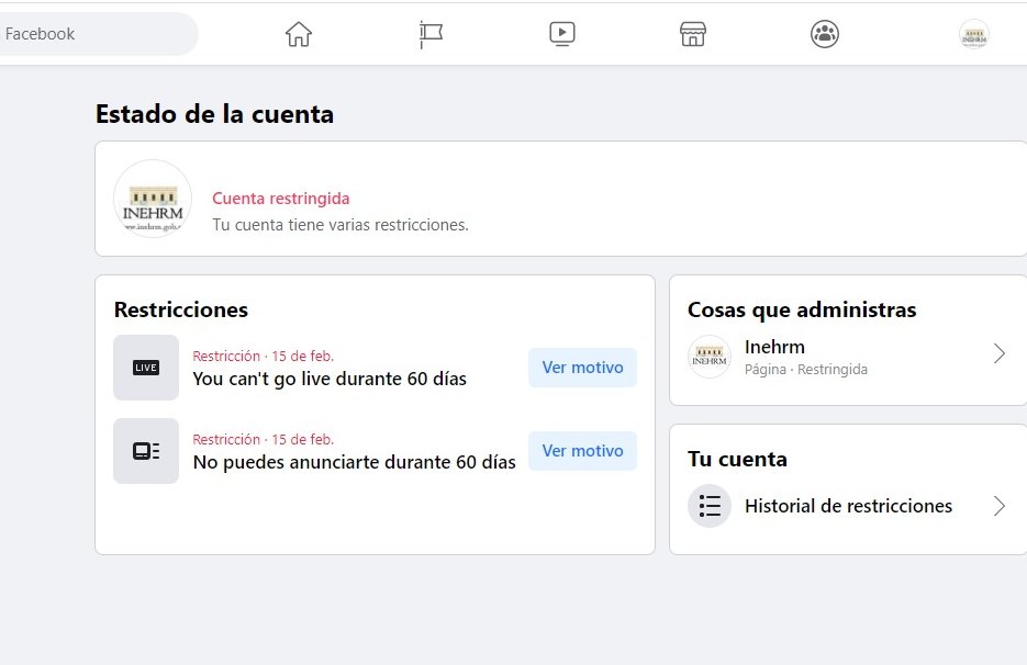 “Ante esto, Facebook comunicó primero que la página estaría restringida durante 24 horas, impidiendo que el Inehrm pueda publicar, editar o borrar contenido; no obstante, Facebook notificó después que se había vuelto a publicar la misma imagen, por lo que elevó la suspensión a 30 días; después, bajo el argumento de una nueva publicación, la sanción llegó a un periodo de 60 días”.