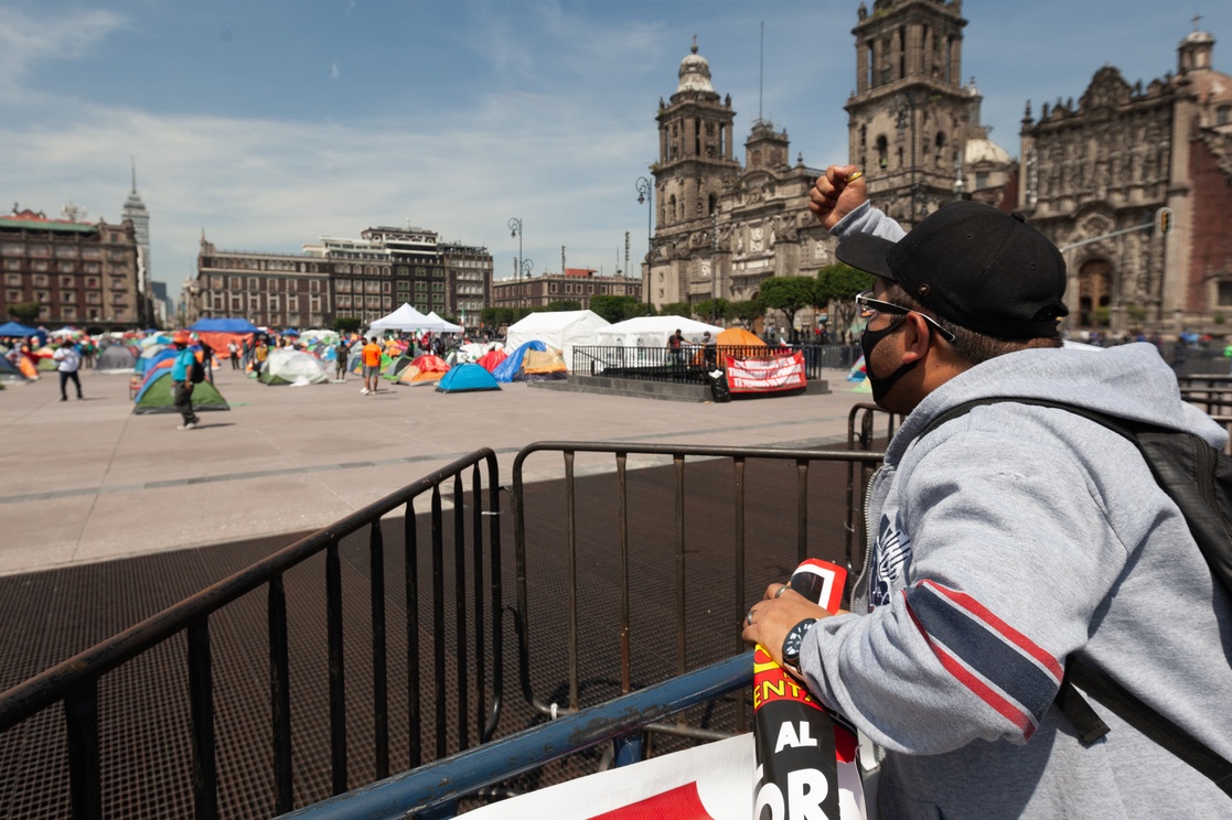 En la Plaza de la Constitución se encontraban tiradas colchonetas, casas de campaña desarmadas, cobijas, extintores, escobas, trapeadores, llantas, sillas de plástico, bancos, botes de basura, imágenes de la Virgen de Guadalupe, banderas de México, garrafones con agua, bicicletas y los tubos de las carpas colocadas desde septiembre del año pasado.
