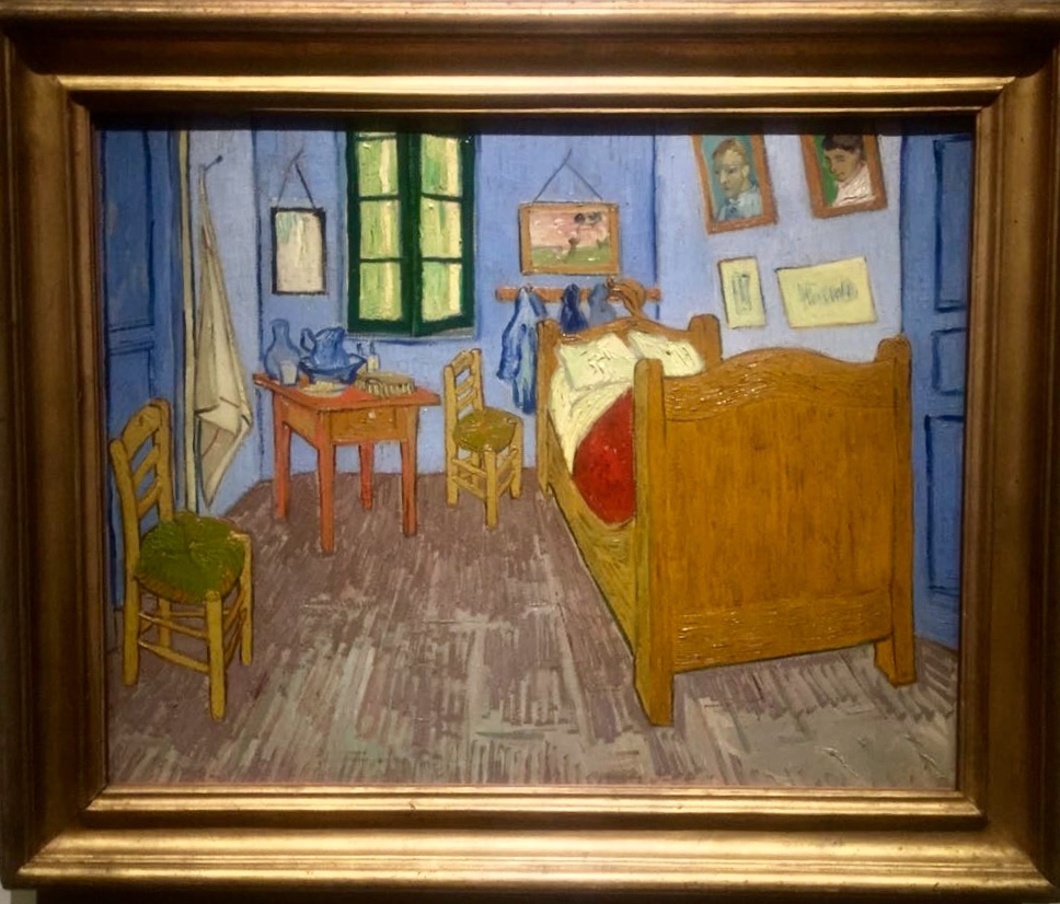 La [i]Habitación en Arlés[/i], de Vincent Van Gogh, por primera ocasión está en nuestro país. La famosa pieza, que tiene en realidad dos versiones previas, ha quedado documentada en intenciones -como gran parte de su obra- a través de las cartas del artista a su hermano Theo. La primera versión de 1888 resultó dañada por una inundación mientras él estaba internado en el hospital, lo que genera que haga una “repetición” en las mismas medidas y formato, y posteriormente, una “reducción” para enviarla a su familia en Holanda. Con esta obra, nos permite entrar a su espacio más íntimo, el de descanso, reposo e indefensión; a la “Casa amarilla”, ubicada en el número 2 de la Place Lamartine, donde viviera entre 1888 y 1889. El artista reconoce esta obra como la más importante que realizara durante su estancia en Arles y menciona que a través de "los muros lila pálido, el suelo de un rojo gastado y apagado, las sillas y la cama amarillo de cromo, las almohadas y la sábana verde limón muy pálido, la manta rojo sangre, la mesa de aseo anaranjada, la palangana azul, la ventana verde (…)" y el resto de los elementos, buscaba expresar una sensación de reposo y calma; desde una austeridad similar a la practicada por los japoneses en sus espacios íntimos. Y más allá de si la obra transmite calma, o no, hay que remarcar que cuando Van Gogh dice Rojo, bien sea “gastado”, “apagado” o “sangre”, dice también [i]Rojo mexicano[/i].