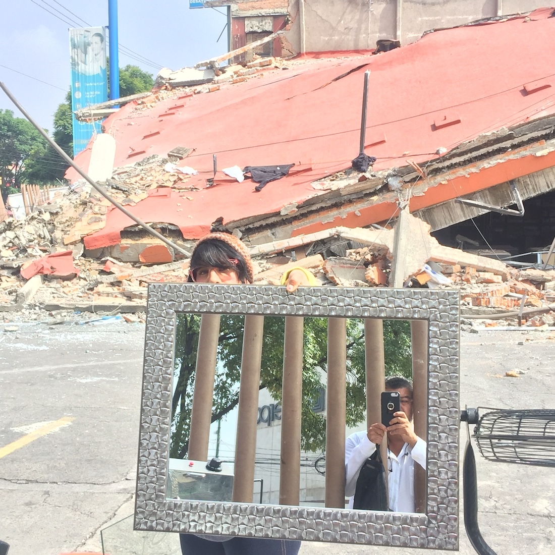 A unos kilómetros cerca de Taxqueña, un edificio muestra como si fuera una maqueta, el secreto que habita en un departamento, su interior tasajeado por la ruptura de la pared que expone la ropa en el tendedero y una sala rota y volada con sus alfombras viejas; un ropero ladeado junto a un sillón viejo de cuero y el retrato de una tía y su padre en la boda.