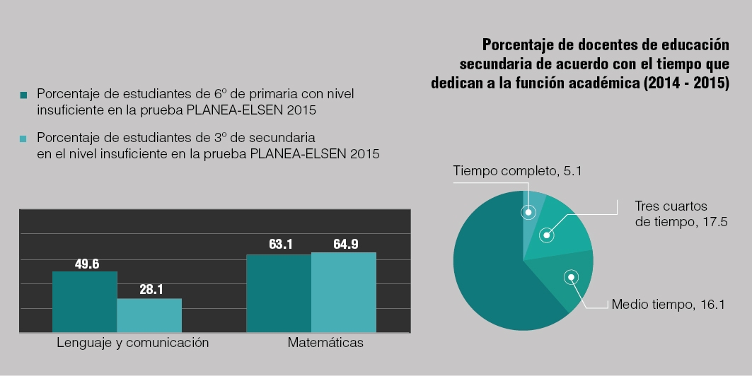 En Yucatán, más de la mitad de los alumnos de primaria y secundaria, tienen nivel de insuficiente en las prueba de matemáticas, es obvio que algo hay que modificar, porque con estos resultados poco se puede avanzar; sobre todo en un contexto en que los maestros (de secundaria) y su situación laboral, los coloca en desventaja; misma que repercute en su desempeño: el 61 por ciento de los profesores de secundaria, trabaja por horas; un 16.1 por ciento está de medio tiempo y apenas un 5 por ciento es de tiempo completo. Es claro que un nuevo modelo, debe contemplar planteamientos y resoluciones acordes a las necesidades que hay que subsanar.