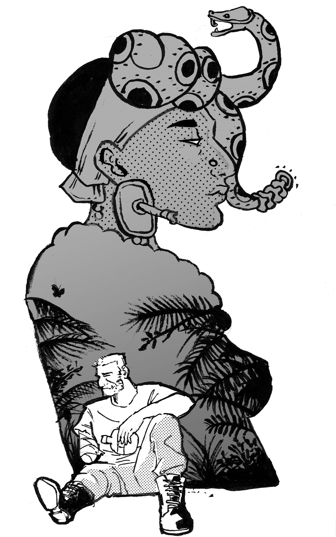 Un buen caminante que abarca grandes trechos en poco tiempo sin más brújula que los astros y su sentido de orientación sobrevive en cualquier percance. Por eso lleva su navaja suiza en caso de que algún animalillo quiera aventajarlo. Qué podría ser, ¿un jabalí?, ¿un ocelote? Quién piensa en eso con ese dolor de vientre que le recuerda las vísceras agonizantes de sus víctimas. Pero eso era otra cosa. La descarga de relámpagos era incomparablemente más violenta que unos cuantos mangos verdes y agua contaminada. Bueno, tal vez la carne de cerdo en achiote, si no estaba bien cocida, y el hielo que picaban de las paredes de la nevera de cervezas en la cantina. No, la metralleta era definitivamente más devastadora. Nuevamente la cascada de espuma verde interrumpe sus conjeturas y lo obliga a ponerse a horcajadas sobre el lecho rojo de arcilla y después a recargarse dificultosamente en un tronco quemado. El sol va cediendo en su inclemencia por lo que decide cerrar los ojos, mientras un sudor helado recorre su espina. El clavo de platino parecería estar haciendo mella y el muñón siente el clamor de la mano ausente. Tal vez hoy sea el 13 ahau, “el día alcanzado”.