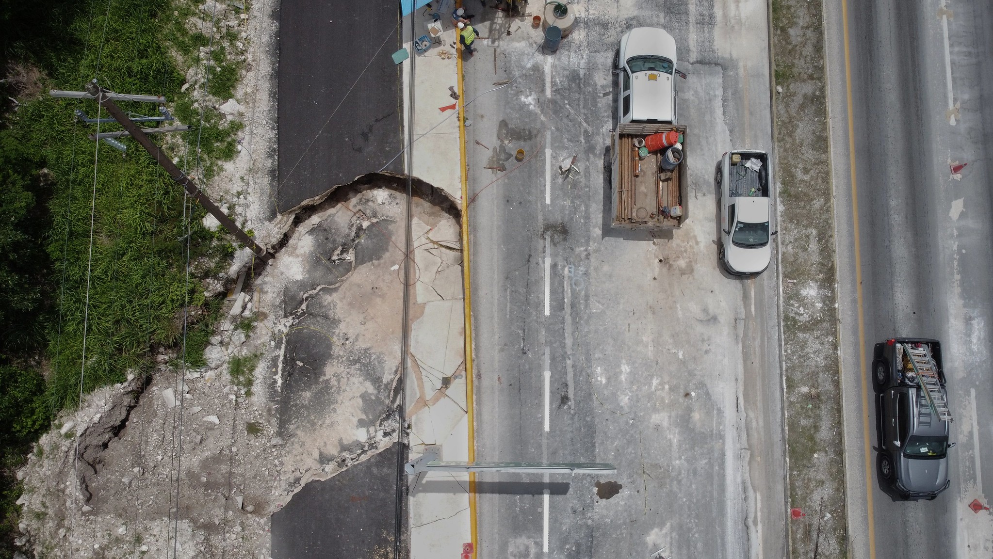 El socavón del kilómetro 307+500 en la carretera 307. Desde hace ya dos meses, la autoridad responsable de la carretera, ahora Fonatur, decidió cerrar tres de los cuatro carriles de la carretera que une a Cancún con la Riviera Maya. Se habilitó un carril adicional para que hubiera uno disponible en cada dirección.