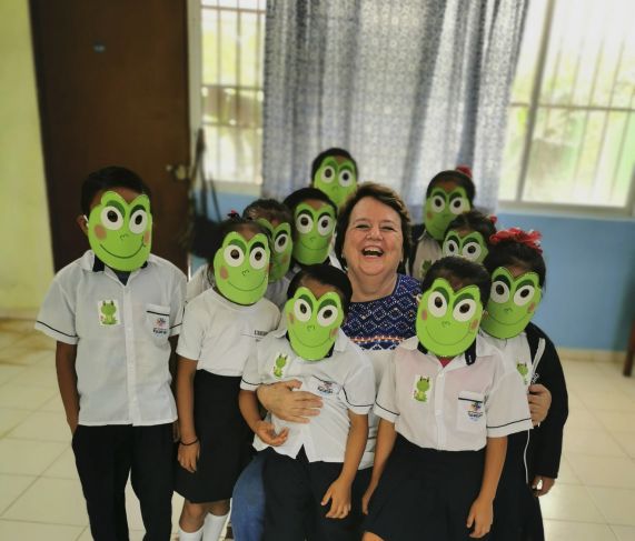 En Chemax, con la directora, de la primaria matutina Rafael Ramírez Castañeda, la Mtra. Mayte Navarrete, acompañada del supervisor Dr., Antonio Novelo Romero, siempre presente, fue una visita distinta a otras ocasiones. Gracias a que aún no está integrado todo el alumnado, hubo espacio para que las mamá acompañaran a sus hijos. Con infinidad de ranas, caracoles, soles, corazones, bellezas que hicieron mamás e hijos, abuelitas o en clase de artísticas, el publico entonó mi canción El Caracol, a todo pulmón. ¿Acaso puede haber mejor regalo para un artista? En otras ocasiones, cada salón tenía su momento de escenario y en una, hasta montaron mi cuento “Una cola especial”, musicalizada.