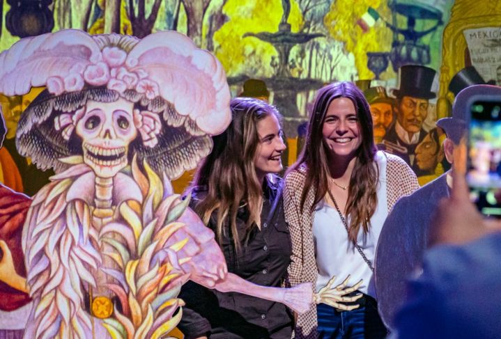 AL SALIR, EN la última sala están de forma onírica los murales de Diego en el Palacio Nacional proyectados con tecnología para fotografías y hacer sentir al público que es parte del mural, como un personaje más en las pinceladas de Rivera.