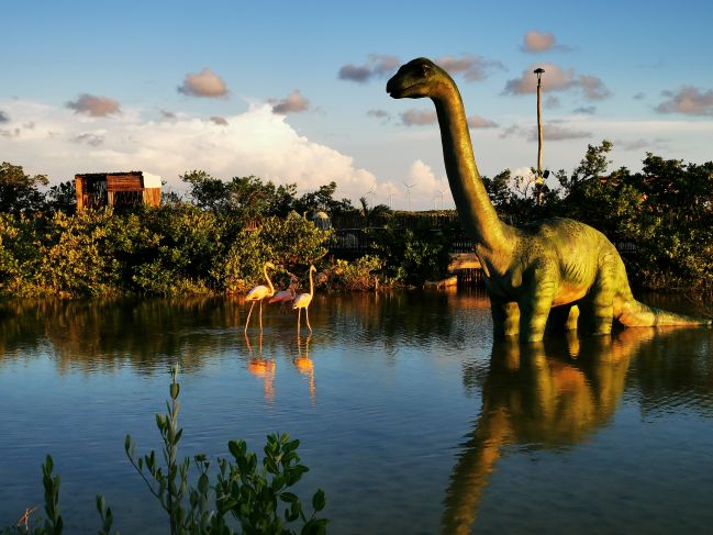 Y es así como el Sendero Jurásico nos pone en el centro de la noticia al contarnos, a través de un kilómetro de museo al aire libre, en medio de la ciénega, que el cráter de Chicxulub o “pulga del diablo”, como se traduce del idioma maya el nombre de la población, se encuentra en la península de Yucatán y su centro se ubica cerca de la actual población de Chicxulub, Puerto, comisaria de Progreso.