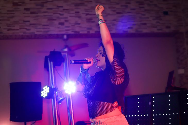 Al llegar al evento nos recibe una vulva inmensa hecha con telas rojas y rosadas, carteles con consignas, pañuelos verdes y un puñado de feministas, aún es temprano. Es el Segundo Festival de la Revolución Feminista, convocado por Siempre Unidas Playa del Carmen, y después de la llegada hay que realizar el soundcheck. Cami carga a Vale mientras Rebeca en su turno de probar se apodera del micrófono. La Vale observa desde el otro extremo de la sala cómo mamá le canta, y se miran todo el tiempo, un hilo ata sus miradas mientras la voz sale por las bocinas.