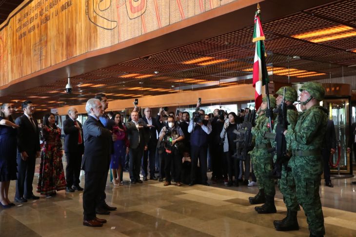 Este 1 de febrero inició el periodo de sesiones de la Cámara de Diputados del Congreso de la Unión. Como parte del ritual se celebraron honores a la bandera con una escolta enviada por la Secretaría de la Defensa Nacional. Nada que no se haya realizado antes, pero en esta ocasión la ceremonia tuvo lugar en el vestíbulo y no en el salón de sesiones. ¿El motivo? La escolta se presentó armada y la normativa interna de la Cámara impide el ingreso de armas.