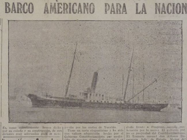 La nota proporciona varios datos, comenzando con el primer nombre del navío, que había sido adquirido de la Yankee Salvage Association, empresa que había enviado el barco correo a Yucatán para participar en el salvamento del cañonero Progreso, que había sido dinamitado y hundido por partidarios del movimiento soberanista que promovió Abel Ortiz Argumedo. El barco recién comprado llevó antes el nombre de Howar y estaría destinado a cubrir la ruta entre Quintana Roo y Yucatán, “pues según los peritos en la materia, tiene magníficas condiciones para navegar por la Península en general”.