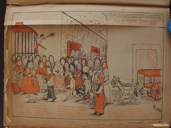 La caricatura pretende ser una instantánea del momento: la multitud rodea a un sacerdote que se antoja muy pequeño para llevar la custodia del Santísimo en procesión, mientras se impide el paso del carruaje tirado por mulas. En el texto acompañante, el segundo párrafo destaca: “Causan escándalo inmenso pues las beatas alumbraban con velas de cera y cebo, y los funcionarios públicos… Señores, pues ‘nada vieron’”.