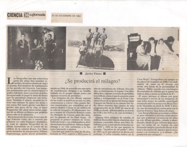 Un hecho cuya singularidad incita la imaginación es el que relata Javier Flores en su artículo “¿Se producirá el milagro?”, publicado en el diario La Jornada el 20 de diciembre de 1993. En él expone el hallazgo de un álbum de fotos antiguas abandonado en una azotea. La figura central de ellas es Alfonso Sagarminaga, músico como Rafael Catana, descubridor del ajado volumen. A semejanza de un puñado de piezas en busca de nuevos marcos significativos, el conjunto de imágenes pasa por varias manos hasta llegar a las páginas de la revista Zonas en que su editor, Fabrizio León, brinda una muestra de las fotografías lanzadas a la deriva del tiempo que sobrevive en sus fragmentos.