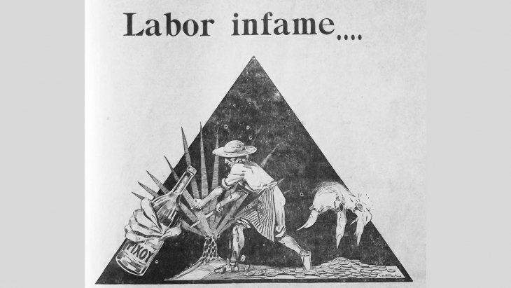 La ilustración que acompaña la columna de hoy es una síntesis de la justificación del combate al aguardiente barato. Apareció publicada en la revista Pica Pica, el 19 de abril de 1919, en lo que fue su segunda época, pues antes se había publicado entre octubre de 1915 y mayo de 1916.