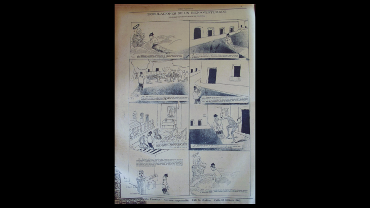 Lamentablemente, el espacio no permite apreciar cabalmente la historieta, pues el Diario Yucateco era de un formato mucho mayor al de La Jornada Maya. El argumento de “Tribulaciones de un bienaventurado”, el espíritu del padre Velázquez consigue permiso de visitar Yucatán para las fiestas del Centenario y se dedica a buscar sus huesos, sin hallarlos en la plaza con su nombre, ni en la que fue su casa, ni en la iglesia donde oficiaba; hasta que el diablo le aconseja que visite el Museo y ahí encuentra “su pobre cráneo con un número y un amarillento papelito pegado en la mollera y exhibido a la pública curiosidad, entre objetos tan interesantes como el bacal con que tapaba su calabazo el cacique indígena Jacinto Pat, y las tijeras con que se recortaba los callos el marido de la nodriza del hijo primogénito del General López de Llergo”. Abatido, el padre Velázquez regresa al Empíreo a pedirle al Padre Eterno que envíe el juicio final, para poder rescatar sus pobres huesos.