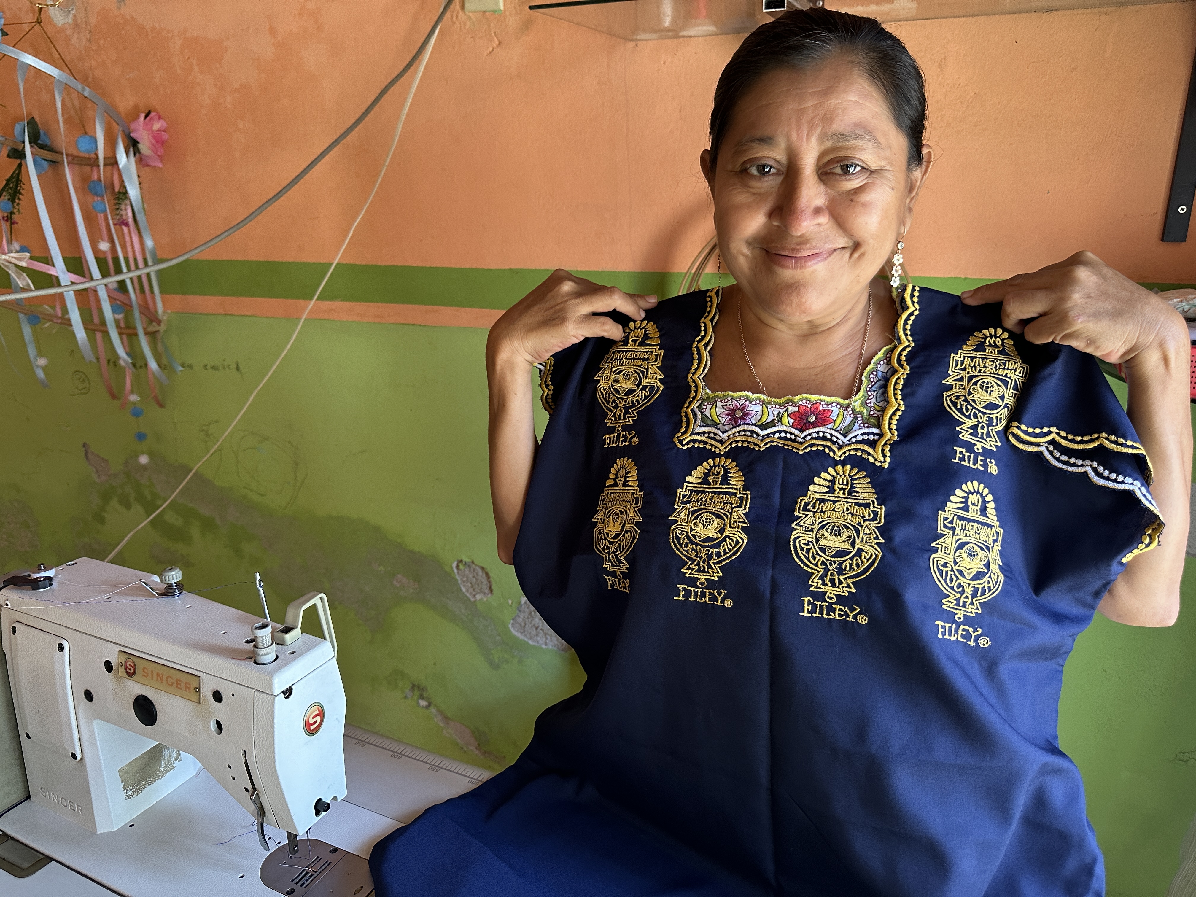 Me contó que, en su juventud, estudió corte y confección en el internado cercano. Que eso le permite armar el trabajo. Que le gusta el dibujo, otras personas tienen que mandar a que se los dibujen, pero que ella disfruta hacerlo. Que antes era más difícil bordar con maquina de pedal, tenía que estar moviendo el aro donde se bordaba. Ahora, con máquina eléctrica, es mucho más fácil. A doña Rosa Chuc, su mamá, que aprendió de su abuela, le enseñó a bordar y le gustó. Su hermanita Leticia, trabajó en la maquiladora y aprendió a utilizar las máquinas eléctricas y después de un tiempo decidió regresar a su casa y ahora se apoyan.
