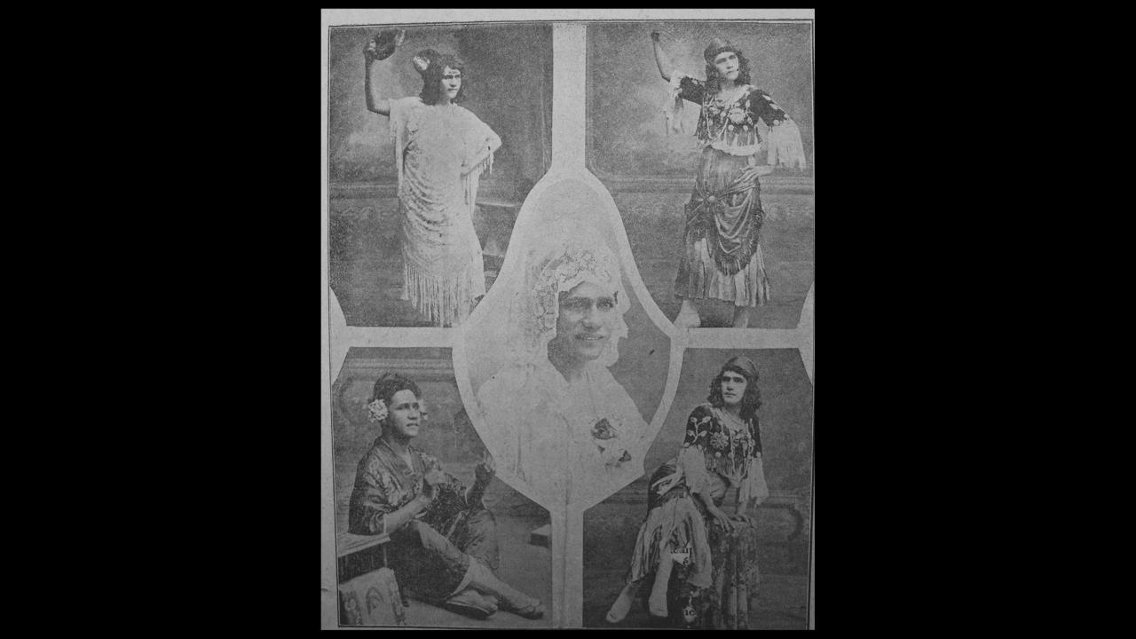 Pero en la cuarta plana, hallamos un sorprendente mosaico fotográfico acompañado de una generosa nota titulada “Leopoldo Martínez, artista de variettes”. Lo llamativo es que en la composición de cinco imágenes es posible reconocer a la misma persona portando trajes femeninos; una que aparenta ser del cercano oriente, de gitana, china y sevillana, y por el titular de la nota, tenemos que se trataba de un varón.