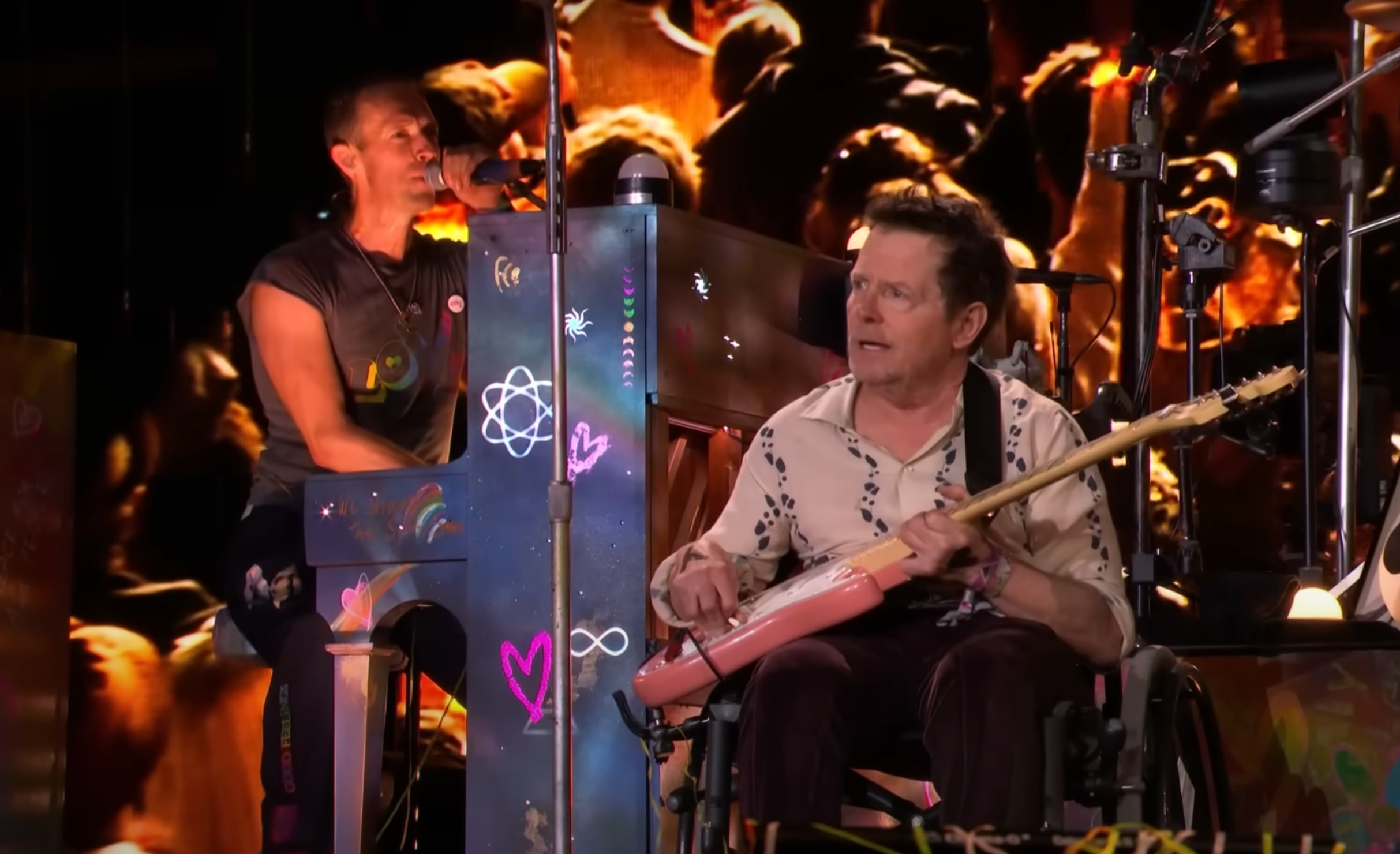 Ahí estaba Michael J. Fox, en silla de ruedas, contrastando con la estridencia de Chris Martin, frontman de la banda. Poco a poco las manos del actor florecieron: los grilletes de los nudillos se aflojaron y con sus palmas ya abiertas comenzó a tocar la guitarra. Eligieron la canción Fix you.