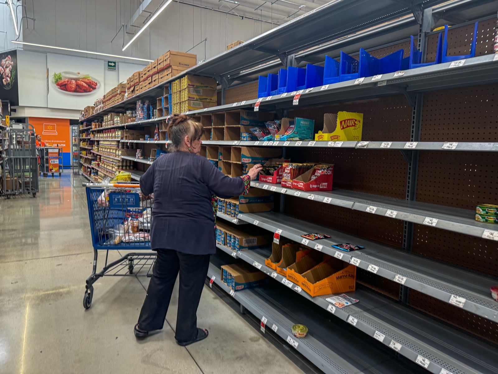 Los instantes de duda los pagué caro. Un tipo se atravesó, cruzó su brazo gordo y lampiño, y con su reloj Mido por poco me arranca el ojo izquierdo, mientras con un movimiento certero empujó hacia su carrito las siete u ocho cajas de galletas que quedaban. Su carro estaba repleto de carne, leche, pan de caja, carnes frías, verduras congeladas, jugos, licor y paquetes de papel de baño.