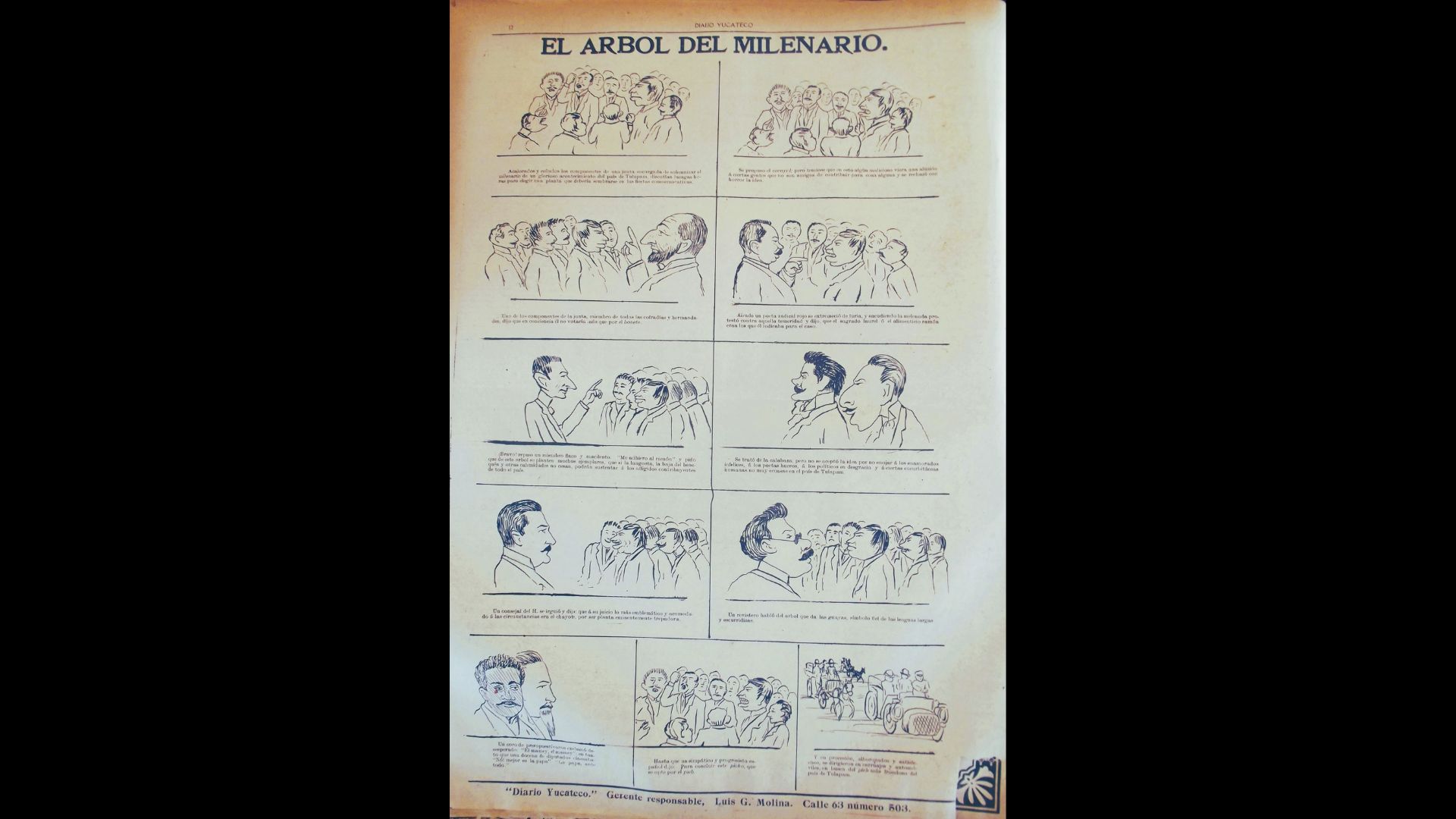 Una semana después, el 30 de julio, el caricaturista del Diario Yucateco -que no firmaba, pero por otras fuentes sabemos que fue un joven de nombre Bernardino Mena Brito, quien después combatió durante la Revolución a las órdenes de Venustiano Carranza y destacó como escritor -retomó aquella discusión y la transformó en un relato en viñetas que obedece al formato de la historieta.
