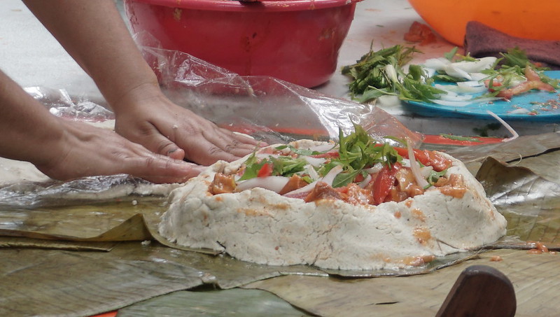 Tortee la masa sobre la hoja de plátano formando una pileta de paredes delgadas que cubra toda la superficie del molde. Rellénela parejo con puerco, pollo, tomate, apazote, dos cucharadas de manteca, suficiente kol y chile habanero al gusto. Doble sobre el guiso los bordes de la pileta y, con ayuda de un pedazo de una bolsa de nailon grande, tortee la masa para formar la tapa y póngala encima sellando los bordes con la misma masa. Vierta y extienda sobre la tapa dos cucharadas grandes de kol y cubra el mucbipollo con hoja de plátano.