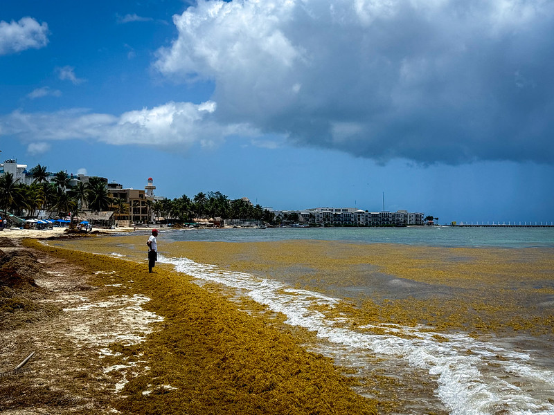 Un ejemplo es la llegada de toneladas y toneladas de sargazo en las costas de Quintana Roo y otros puntos del Caribe y del Golfo de México alrededor de 2013, hace unos 12 años. El 4 de junio 2025 Patricia Vázquez reportó en La Jornada Maya que este año la cantidad de sargazo arribando a Q. Roo puede ser mucho mayor a las 522 mil toneladas de 2018. Esta macroalga flotante de color café dorado proviene del Gran Cinturón del Sargazo del Atlántico Tropical y llega a nuestras costas por el movimiento de las corrientes marinas.