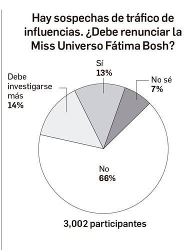 El certamen Miss Universo 2025. Hay sospechas de tráfico de influencias. ¿Debe renunciar la Miss Universo Fátima Bosh? Este es el tema del sondeo de esta semana. Los resultados, en la gráfica.