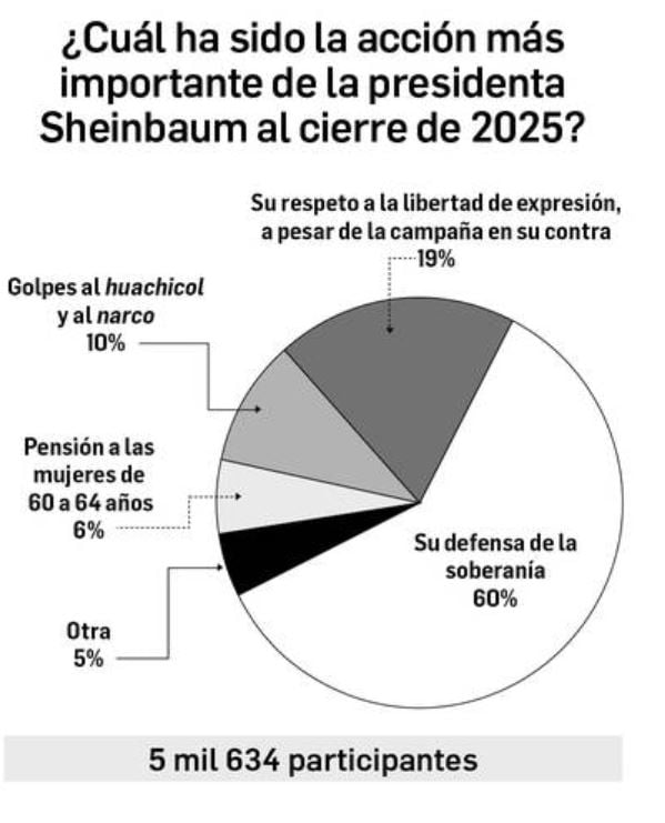 La Presidenta Sheinbaum viaja a Washington para reunirse con Donald Trump. La popularidad del mandatario estadunidense está a la baja, la de Sheinbaum se mantiene alta. ¿Cuál ha sido la acción más importante de su administración al cierre de 2025? Los resultados, en la gráfica:
