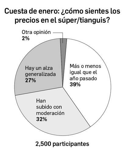 Cuesta de enero. ¿Cómo sientes los precios en el súper/tianguis? Éste es el tema del sondeo de esta semana. Los resultados, en la gráfica.